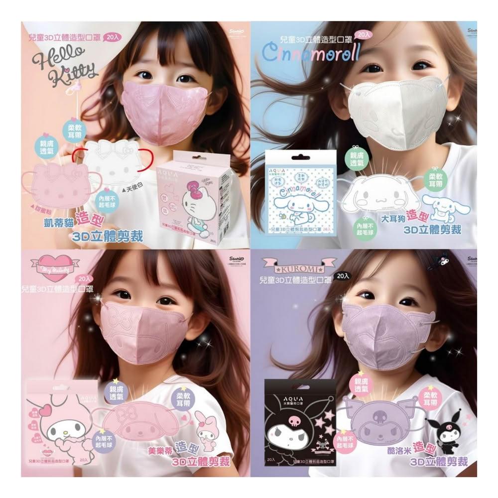 AQUA三麗鷗 兒童3D立體剪裁造型口罩 Hello Kitty凱蒂貓 酷洛米 大耳狗 美樂蒂 20入/盒