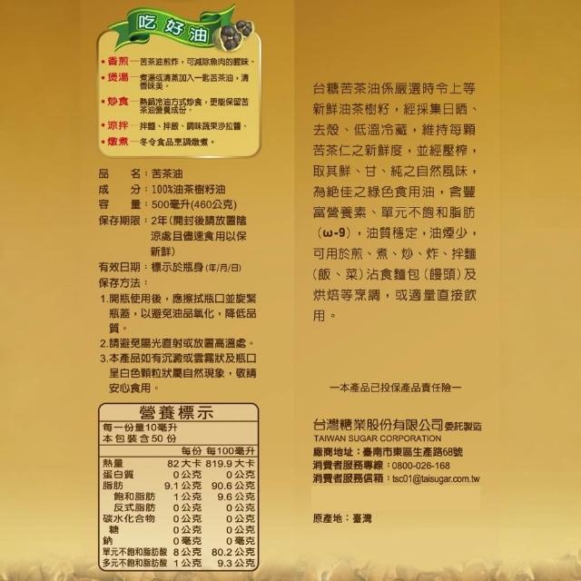 台糖橄欖油 苦茶油 特級初榨橄欖油 無添加任何化學成分 500ml/瓶 原廠公司貨