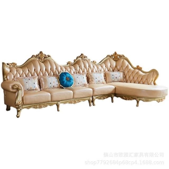 免運 免稅 歐式沙發頭層真皮轉角貴族金色沙發實木雕花L型大小戶型奢華家具