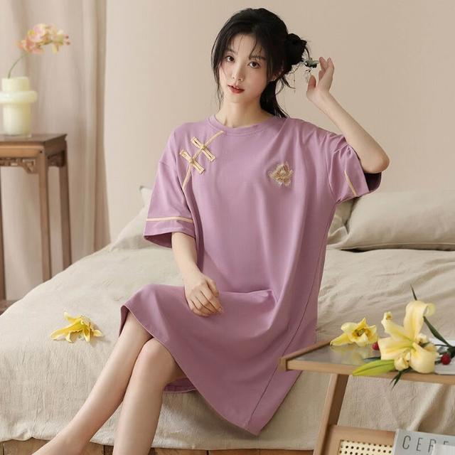 沂洋商城 睡裙女士夏季薄款純棉短袖優雅甜美國風睡衣2024新款萊卡棉家居服
