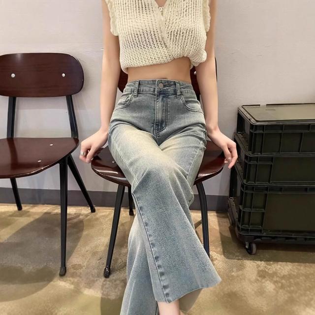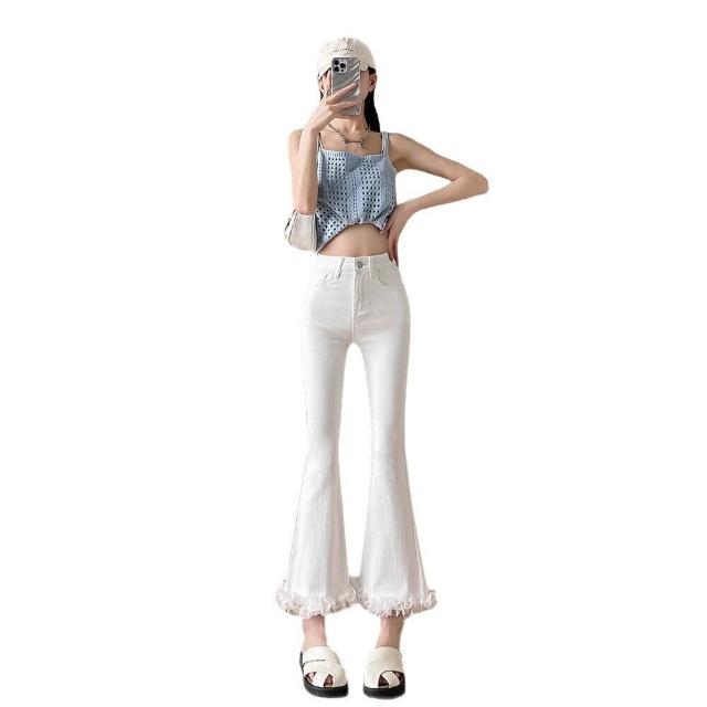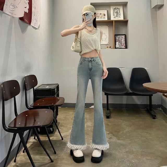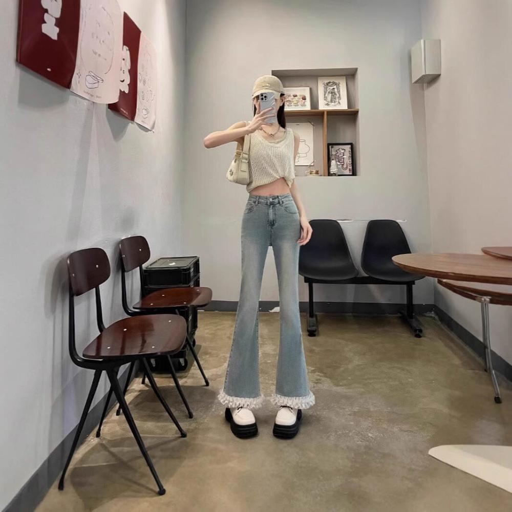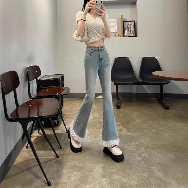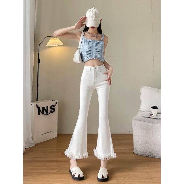 沂洋商城 年微喇叭牛仔褲女春夏新款小個子高腰九分褲花邊設計感蕾絲拼