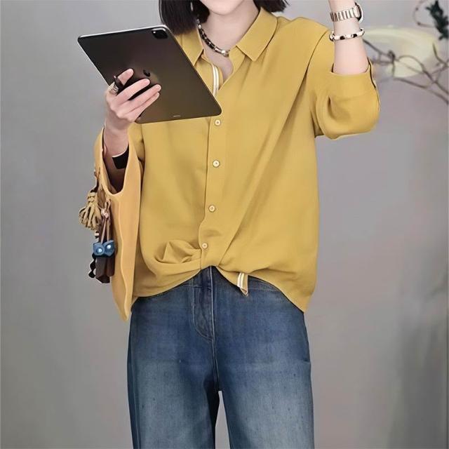 春款上衣 長袖 罩衫 襯衫 復古黃色polo領薄款長袖襯衫女2026新款春夏寬松顯瘦休閑防曬上衣 沂洋商城
