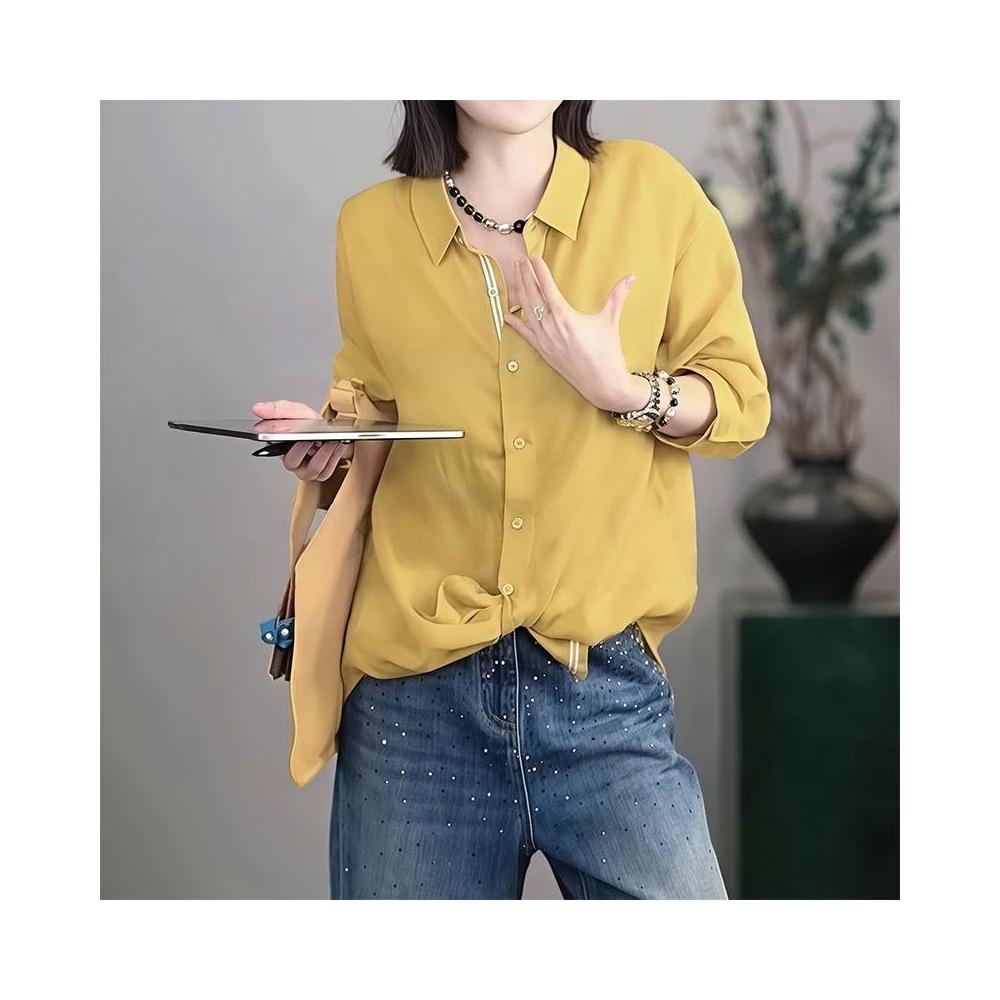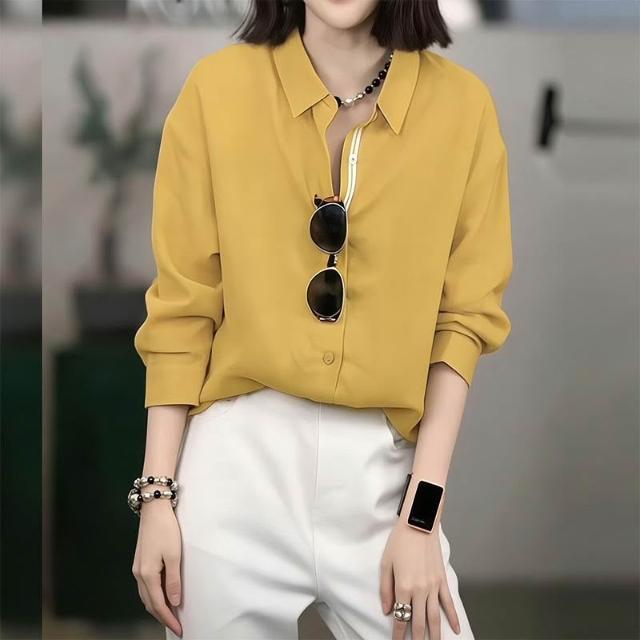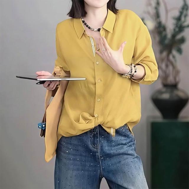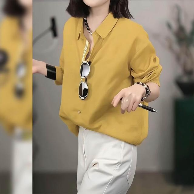 春款上衣 長袖 罩衫 襯衫 復古黃色polo領薄款長袖襯衫女2026新款春夏寬松顯瘦休閑防曬上衣 沂洋商城