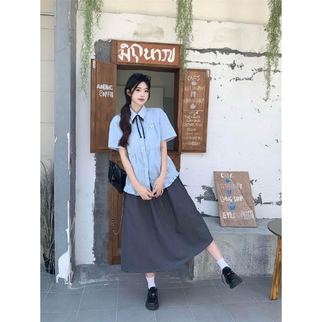 夏季短袖 上衣 T恤 實拍 淺藍色POLO領日系學院風襯衫女夏季甜美可愛上衣短袖開衫女 沂洋商城