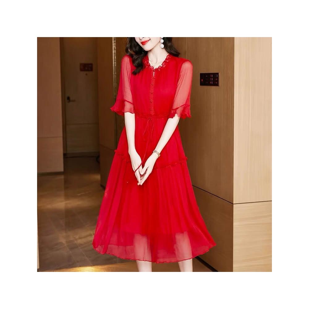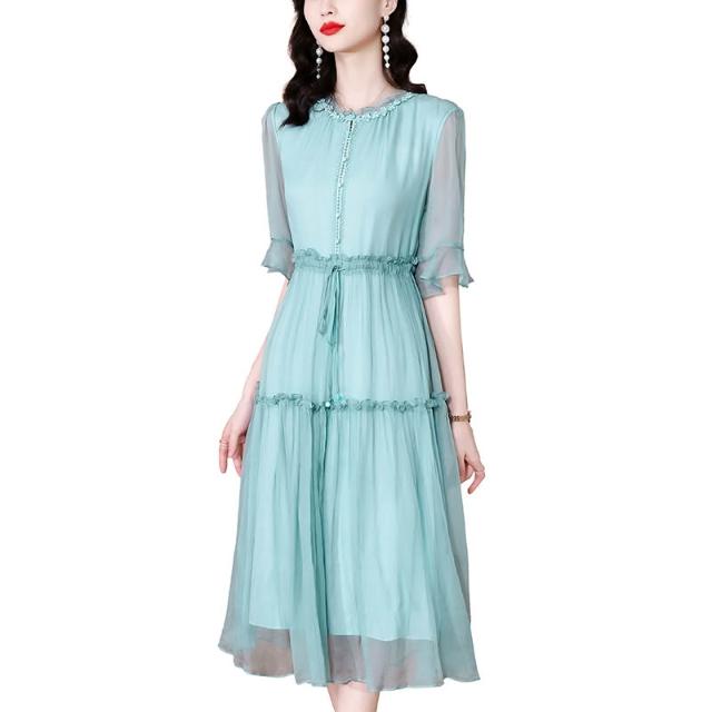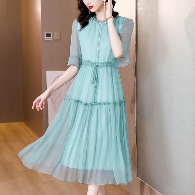 春夏裙子 連衣裙 2022新款年輕媽媽夏裝時尚桑蠶絲連衣裙新款中年女裝氣質收腰裙子 沂洋商城