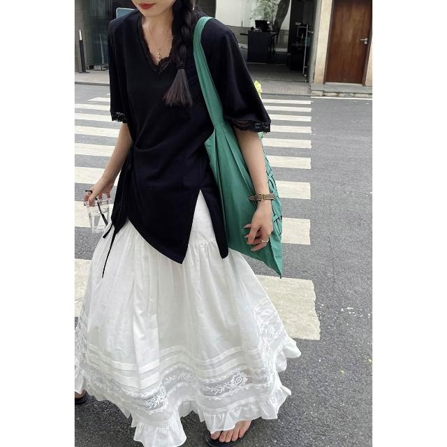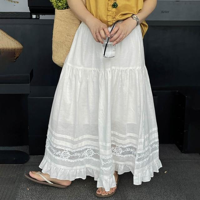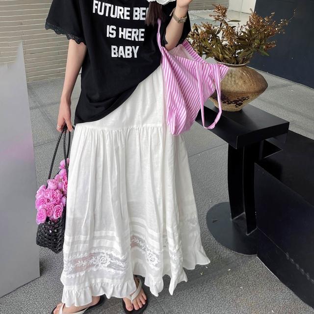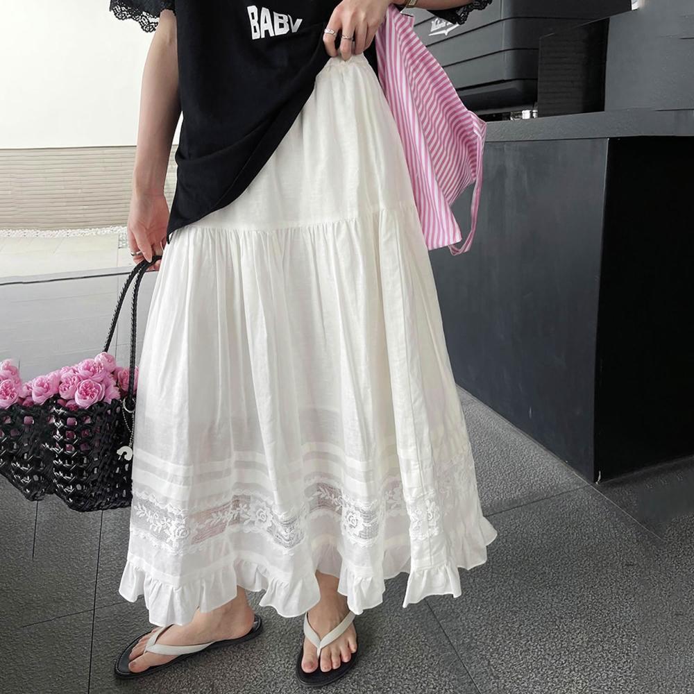 夏款裙子 半身裙 白色半身裙2025年春夏季新款棉麻a字裙高腰顯瘦蕾絲拼接中長裙子 沂洋商城