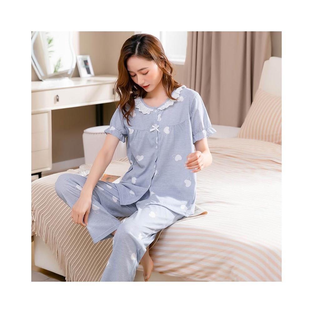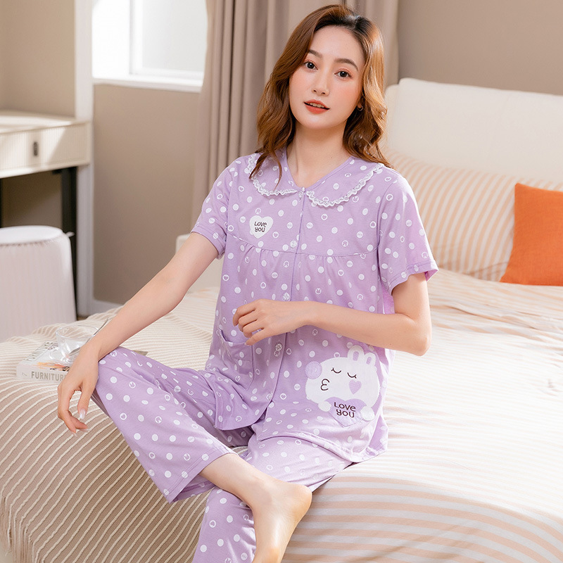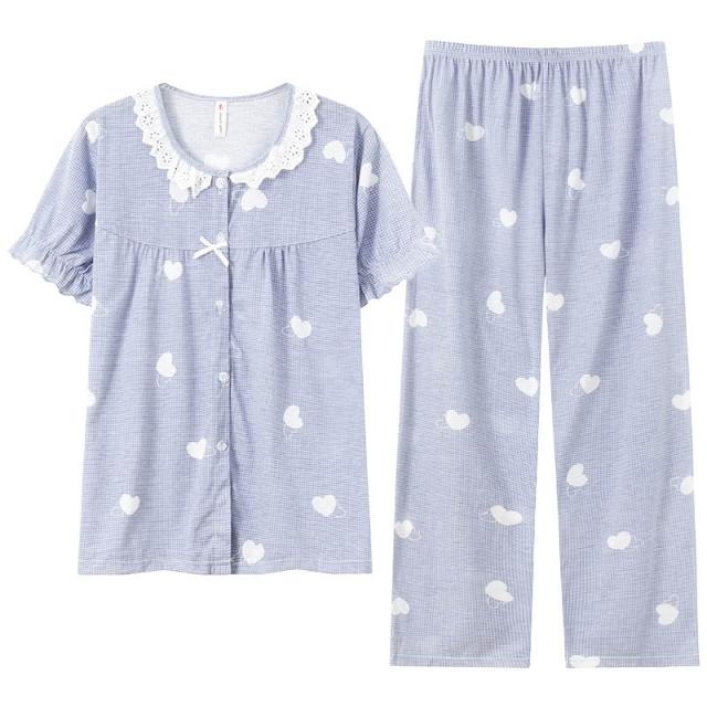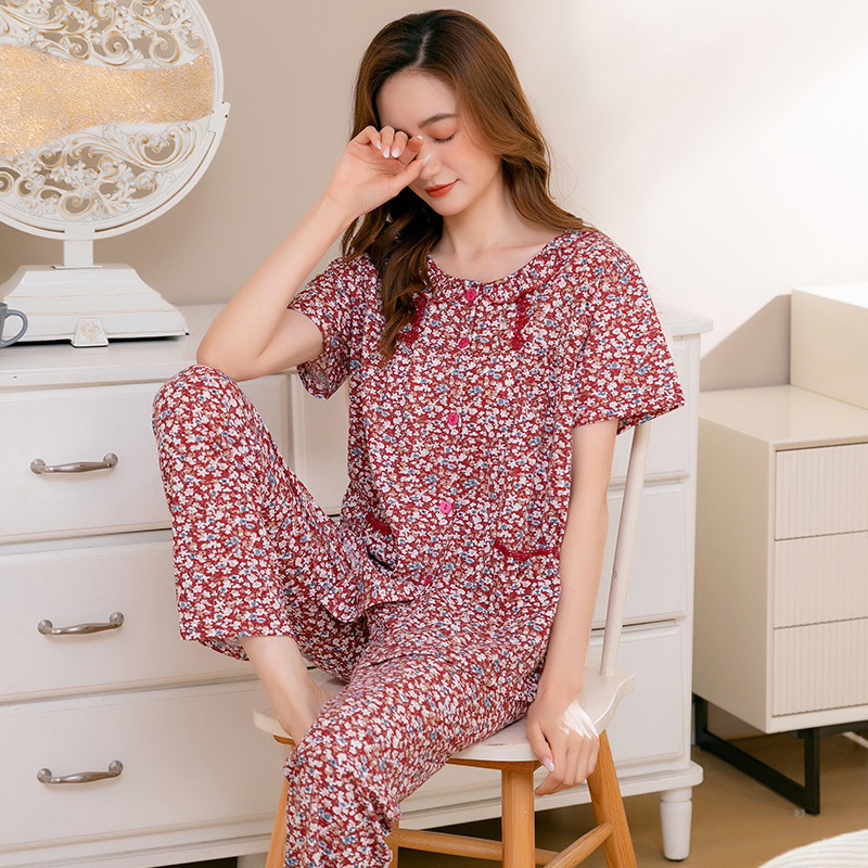 夏季睡衣 居家服 春夏新款中年媽媽睡衣女士圓領開衫棉質寬松大碼家居服套裝可外穿 沂洋商城