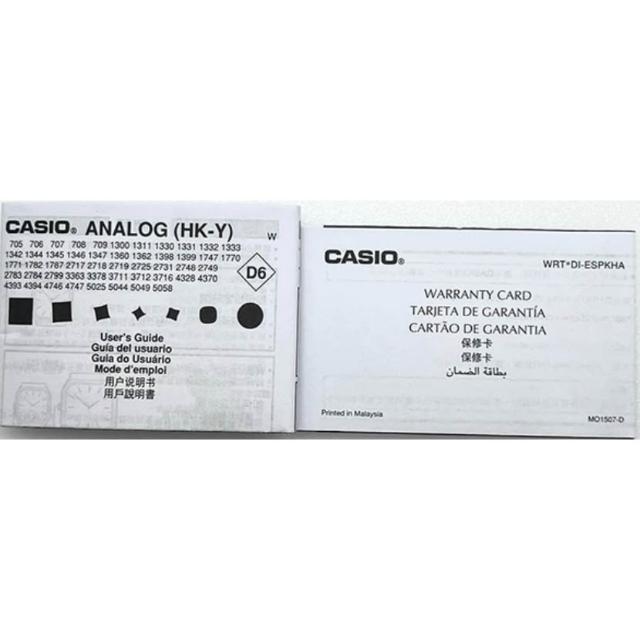 - 本保修卡僅在購買本產品的國家接受服務時有效。 除與鐘錶產品相關的消耗品及使用期有限的部件(例如:電池、玻璃、錶帶(手錶)、錶殼)之外,在正常的使用情況下,由於本產品的質量問題所造成的故障從購買日起用戶可以得到1年的免費保修("保修期")。 在保修期內,持購買憑證,由 CASIO及其代理商向用戶提供保修,包括相同或同類 CASIO原件或產品的更換服務。 在實施保修服務時,用戶直接送往或用自負郵費的方式,把購買的本公司產品和購買本公司產品的票據複印件或能夠証明購買日期憑証的複印件一起送往或寄往 CASIO服務中心或購買本產品的商店。 屬於保修的有效期內修理,本公司不另收零件費和人工費。 為了避免運送途中的損壞或遺失,本公司建議用戶在包裝好郵包的同時,用附帶保險的掛號方式郵寄。 凡有下列一種問題或情況的.為收費修理: (1)由於誤操作、亂操作或使用不當所造成的故障; (2)由於火災或其他自然災害所造成的故障; (3)由於CASIO服務中心以外的任何人、所作的錯誤修理或調整所造成的故障; (4)鍾錶外殼、錶帶(手錶)玻璃及電池的損壞或磨損; (5)在要求修理時,未出示