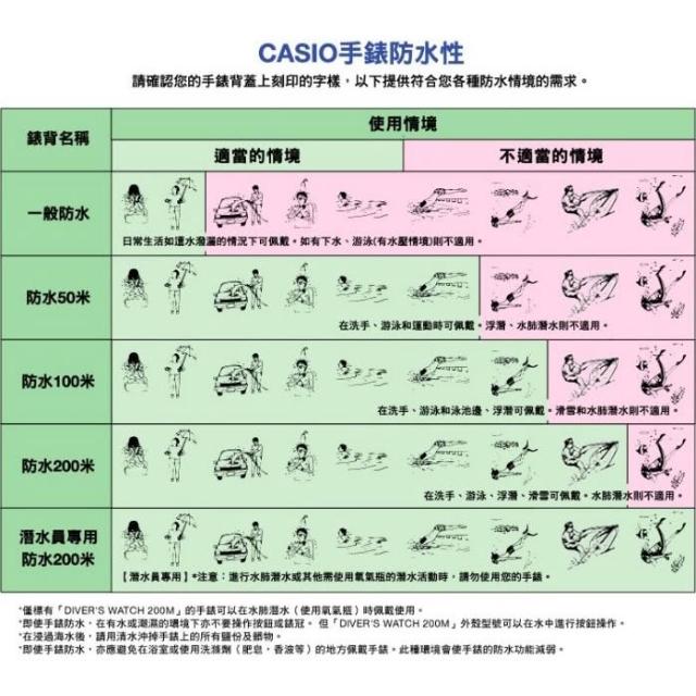 - 本保修卡僅在購買本產品的國家接受服務時有效。 除與鐘錶產品相關的消耗品及使用期有限的部件(例如:電池、玻璃、錶帶(手錶)、錶殼)之外,在正常的使用情況下,由於本產品的質量問題所造成的故障從購買日起用戶可以得到1年的免費保修("保修期")。 在保修期內,持購買憑證,由 CASIO及其代理商向用戶提供保修,包括相同或同類 CASIO原件或產品的更換服務。 在實施保修服務時,用戶直接送往或用自負郵費的方式,把購買的本公司產品和購買本公司產品的票據複印件或能夠証明購買日期憑証的複印件一起送往或寄往 CASIO服務中心或購買本產品的商店。 屬於保修的有效期內修理,本公司不另收零件費和人工費。 為了避免運送途中的損壞或遺失,本公司建議用戶在包裝好郵包的同時,用附帶保險的掛號方式郵寄。 凡有下列一種問題或情況的.為收費修理: (1)由於誤操作、亂操作或使用不當所造成的故障; (2)由於火災或其他自然災害所造成的故障; (3)由於CASIO服務中心以外的任何人、所作的錯誤修理或調整所造成的故障; (4)鍾錶外殼、錶帶(手錶)玻璃及電池的損壞或磨損; (5)在要求修理時,未出示