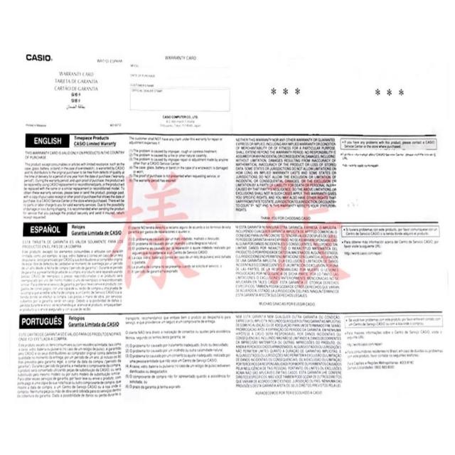 - 本保修卡僅在購買本產品的國家接受服務時有效。 除與鐘錶產品相關的消耗品及使用期有限的部件(例如:電池、玻璃、錶帶(手錶)、錶殼)之外,在正常的使用情況下,由於本產品的質量問題所造成的故障從購買日起用戶可以得到1年的免費保修("保修期")。 在保修期內,持購買憑證,由 CASIO及其代理商向用戶提供保修,包括相同或同類 CASIO原件或產品的更換服務。 在實施保修服務時,用戶直接送往或用自負郵費的方式,把購買的本公司產品和購買本公司產品的票據複印件或能夠証明購買日期憑証的複印件一起送往或寄往 CASIO服務中心或購買本產品的商店。 屬於保修的有效期內修理,本公司不另收零件費和人工費。 為了避免運送途中的損壞或遺失,本公司建議用戶在包裝好郵包的同時,用附帶保險的掛號方式郵寄。 凡有下列一種問題或情況的.為收費修理: (1)由於誤操作、亂操作或使用不當所造成的故障; (2)由於火災或其他自然災害所造成的故障; (3)由於CASIO服務中心以外的任何人、所作的錯誤修理或調整所造成的故障; (4)鍾錶外殼、錶帶(手錶)玻璃及電池的損壞或磨損; (5)在要求修理時,未出示
