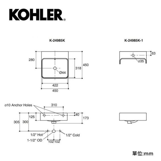 KOHLER美國KOHLER Forefront 45cm壁掛式面盆(含毛巾桿) K-24984K-1-0 450*450mm