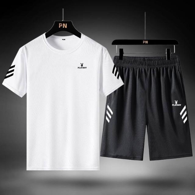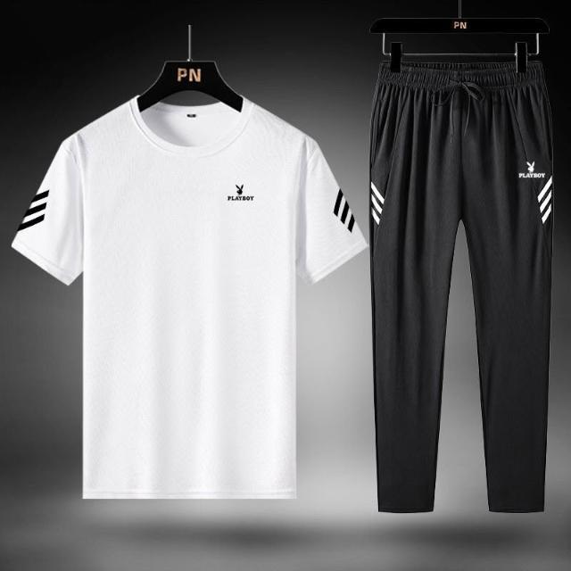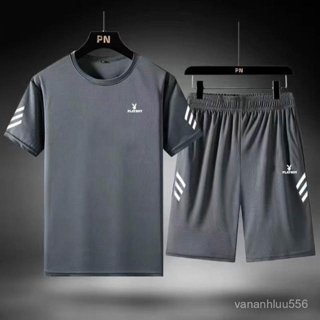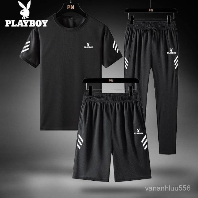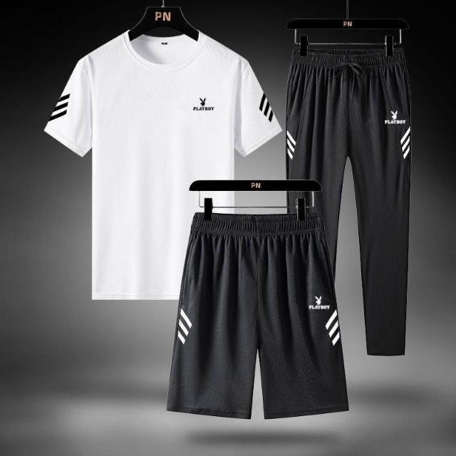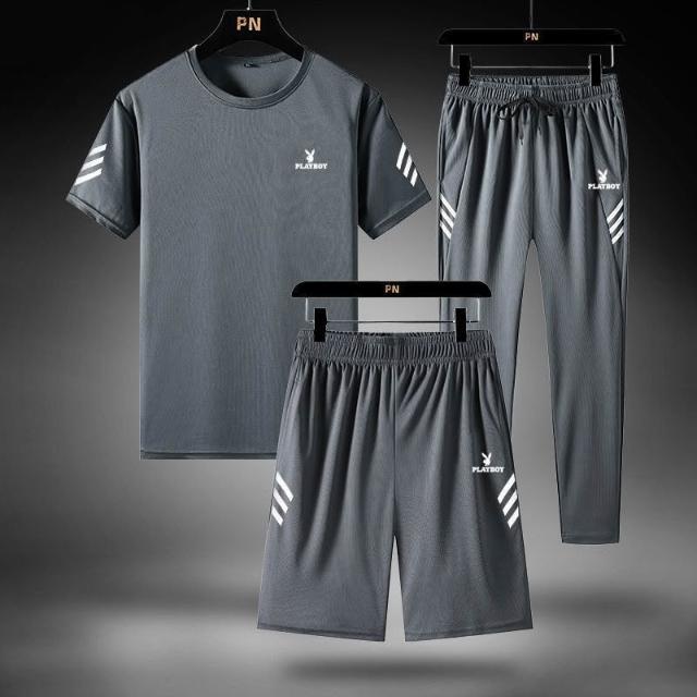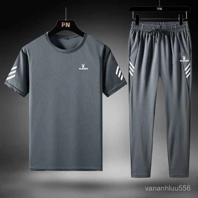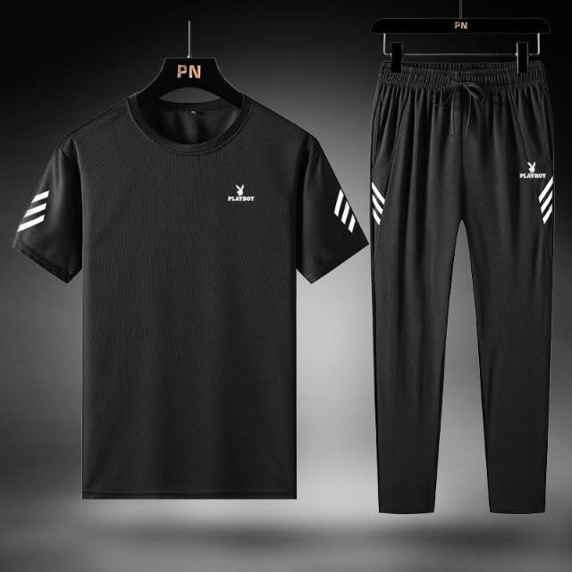 花花公子三件套男寬鬆冰絲速幹T恤休閒運動服爸爸裝夏季套裝/單件