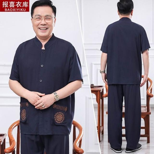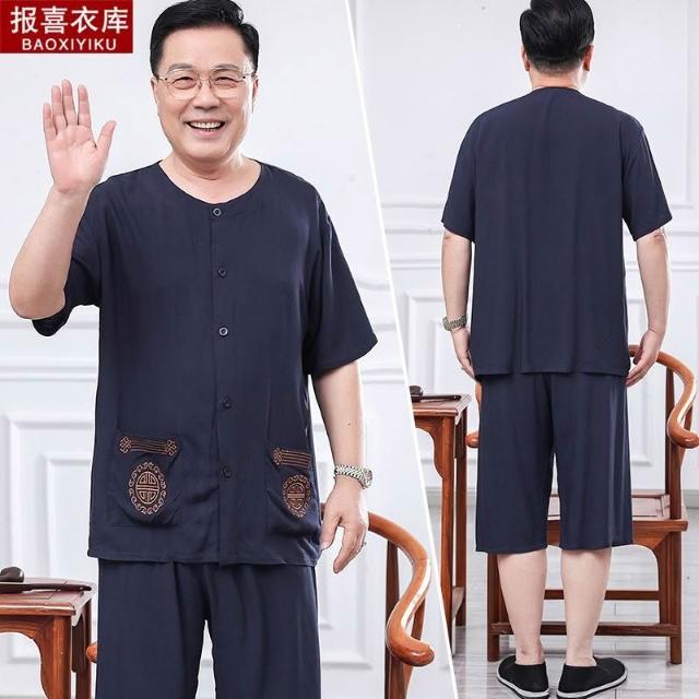 中老年人夏裝短袖套裝男爺爺襯衫兩件套爸爸寬鬆綿綢老人薄款衣服