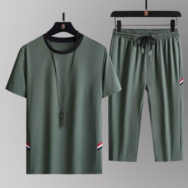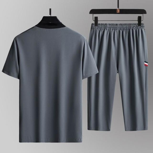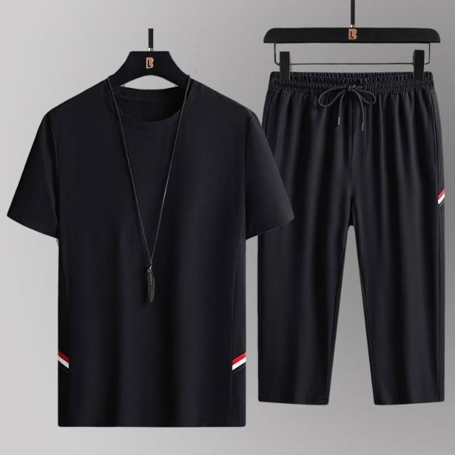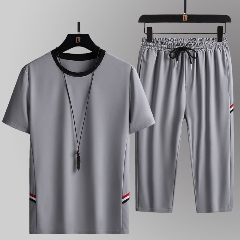 2026夏季男士透氣休閒寬鬆冰絲套裝兩件套短袖大碼七分褲運動套裝