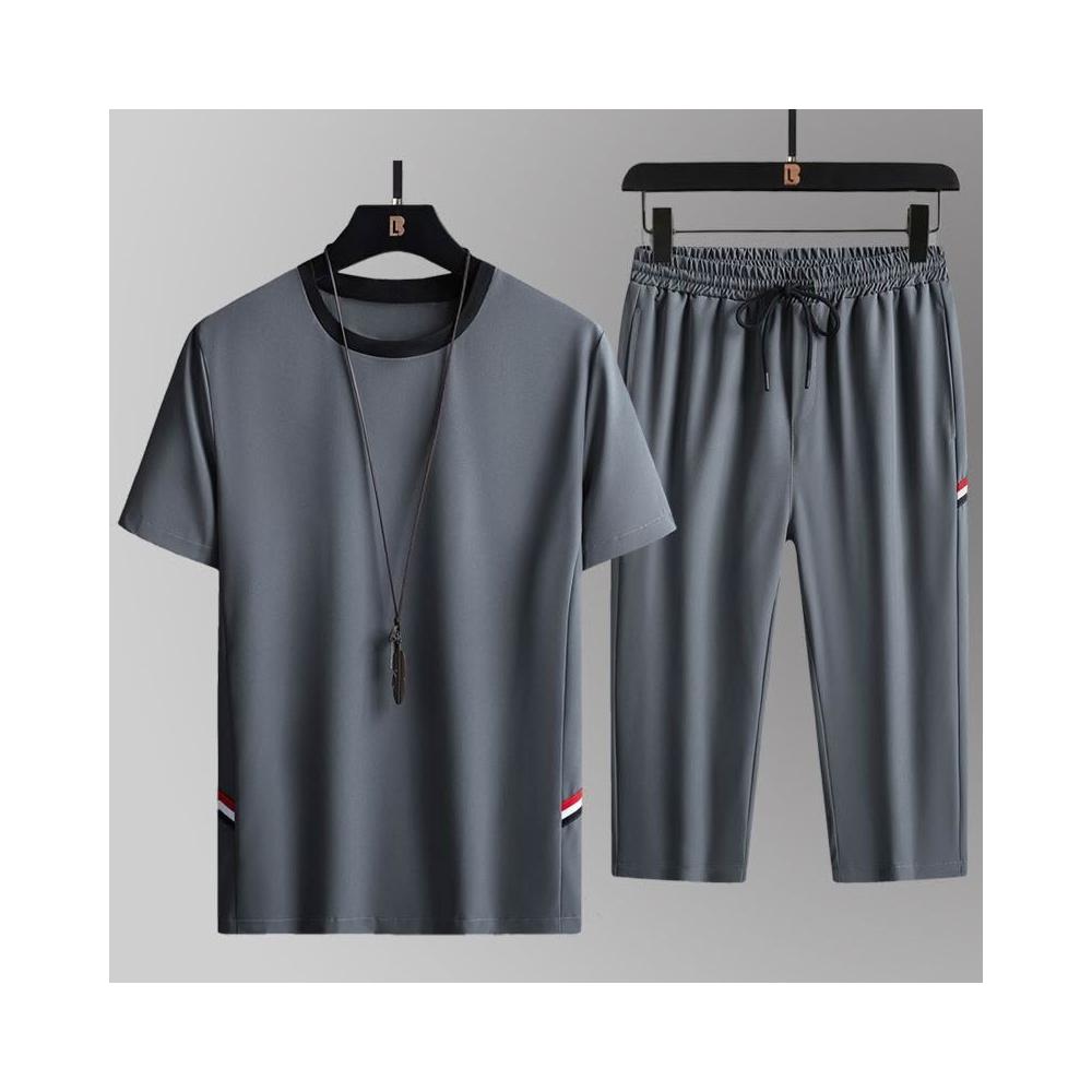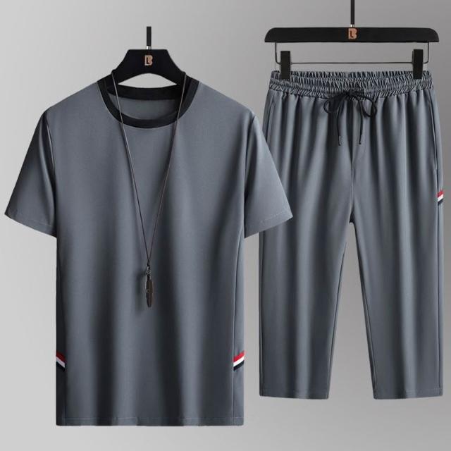 2026夏季男士透氣休閒寬鬆冰絲套裝兩件套短袖大碼七分褲運動套裝