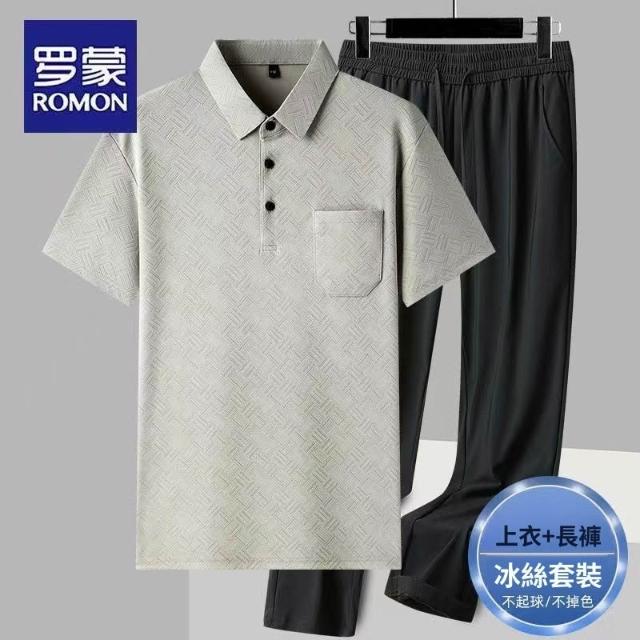 羅蒙套裝男士冰絲夏季POLO短袖休閒中老年中年爸爸夏裝兩件套長褲