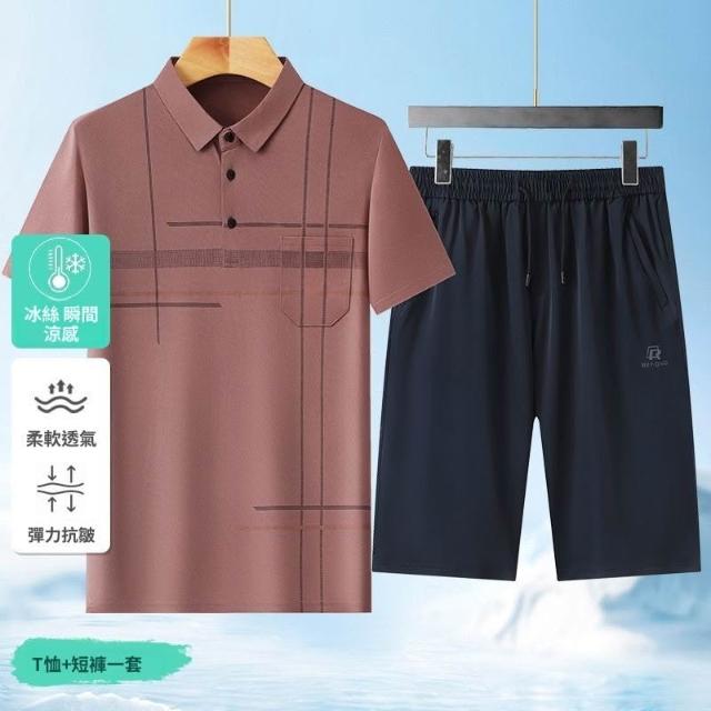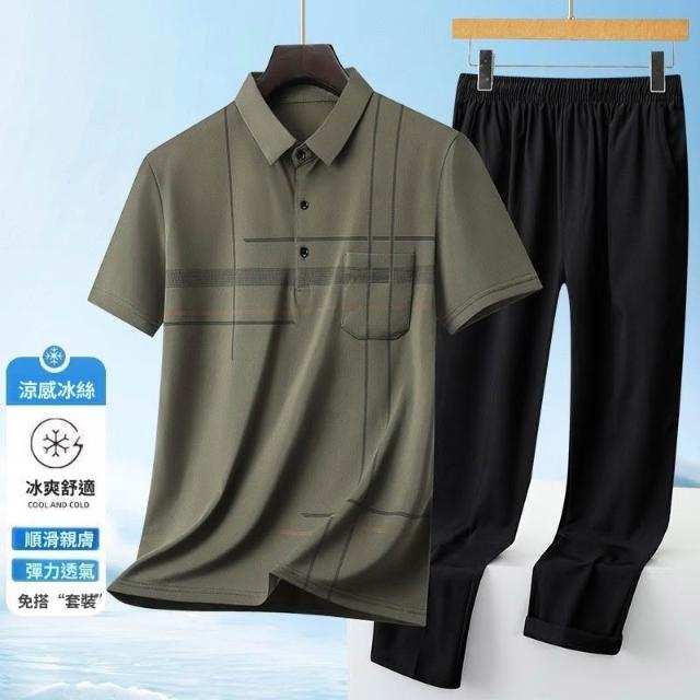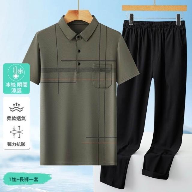 夏季冰絲套裝中老年人男裝休閒上衣爸爸短袖POLO衫半袖休閒長褲