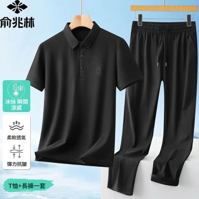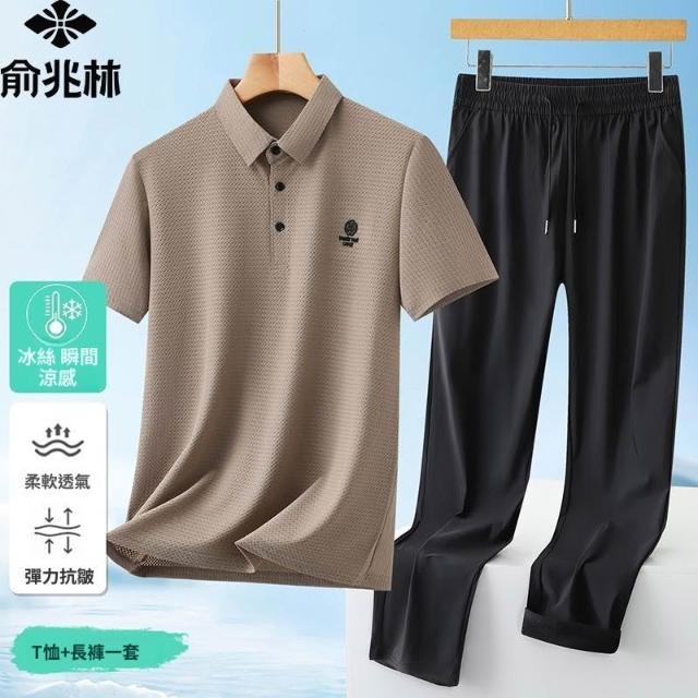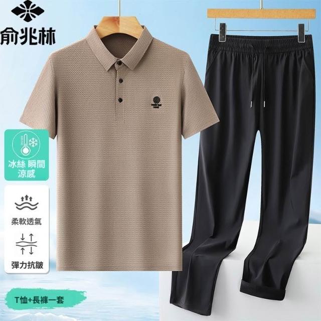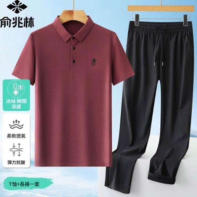 俞兆林中老年男士夏季短袖T恤二件套中年爸爸POLO衫長褲休閒套裝