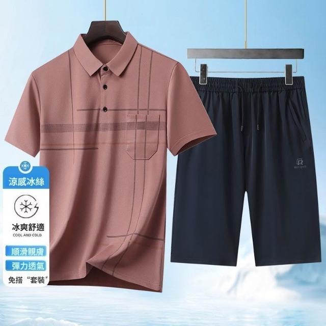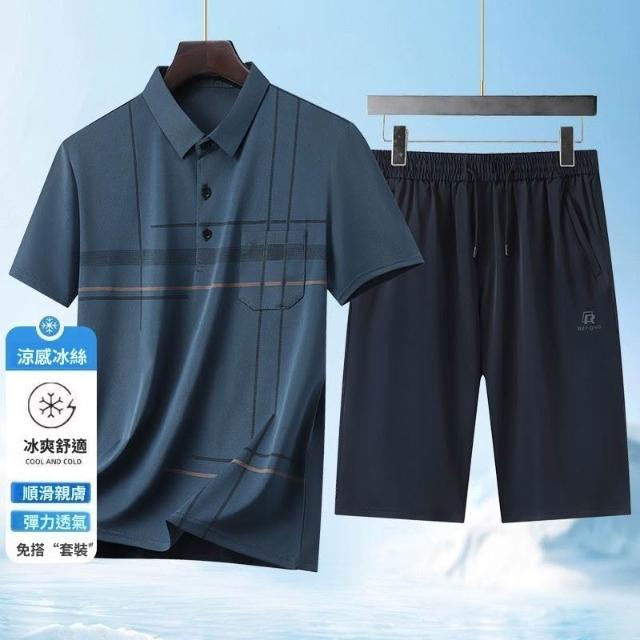 夏季男士短袖T恤套裝冰絲翻領POLO衫冰絲短褲中老年男士爸爸父親