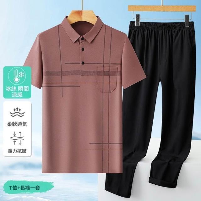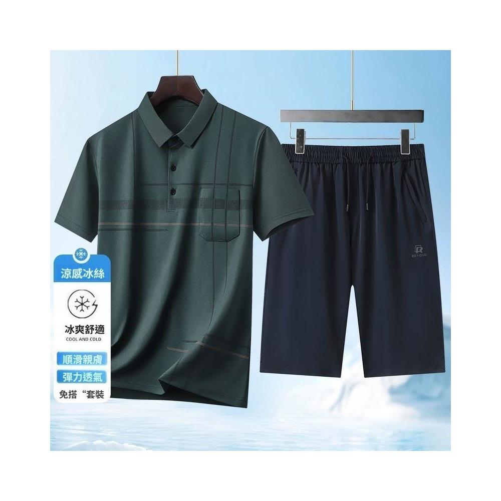 夏季男士短袖T恤套裝冰絲翻領POLO衫冰絲短褲中老年男士爸爸父親