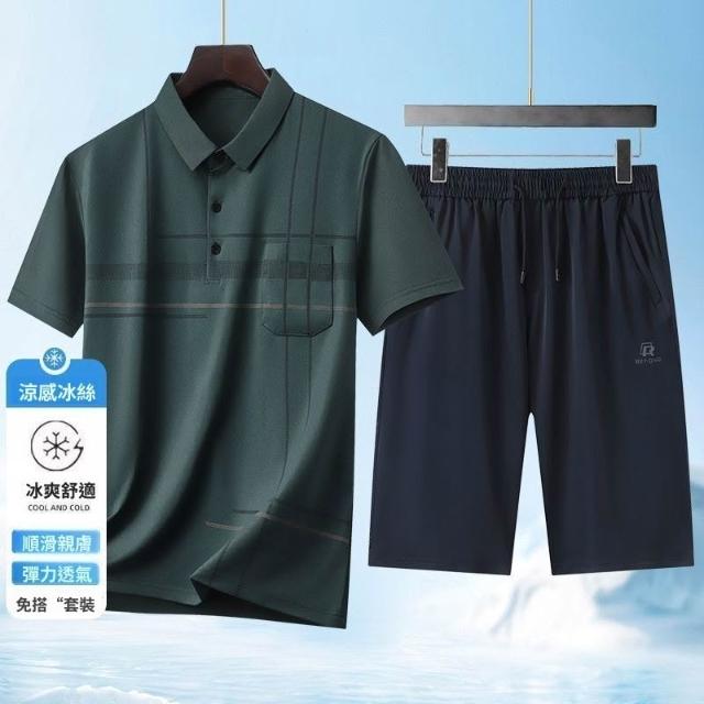 夏季男士短袖T恤套裝冰絲翻領POLO衫冰絲短褲中老年男士爸爸父親