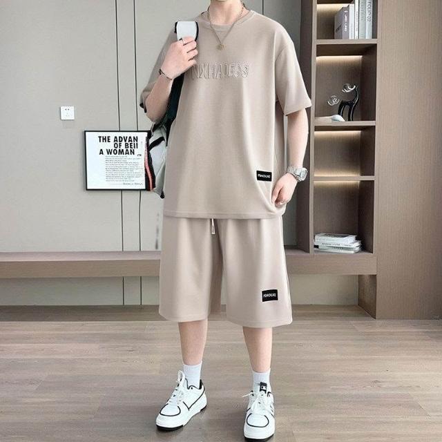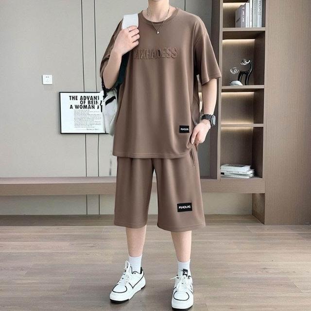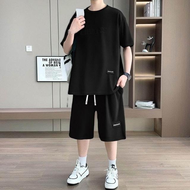 短袖短褲男士夏季休閒運動套裝青少年鋼印半袖上衣休閒寬鬆運動服