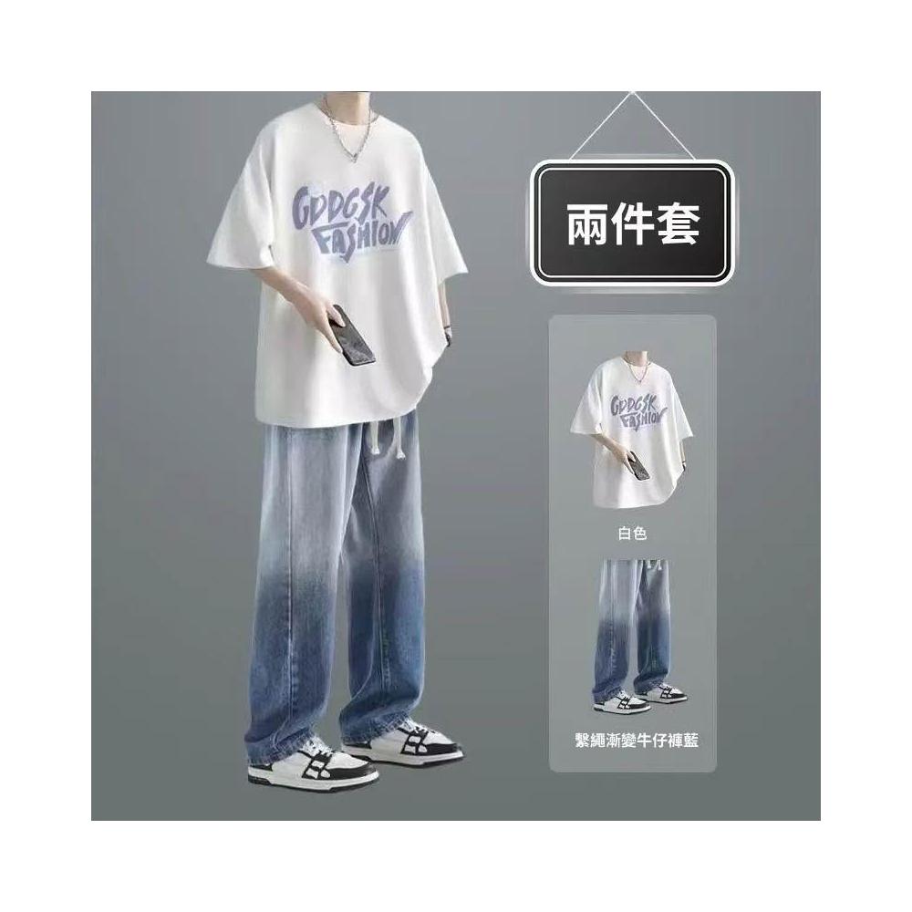 夏季短袖男生休閒套裝潮T恤男裝一整套搭配直筒牛仔褲兩件套穿搭