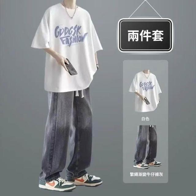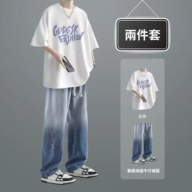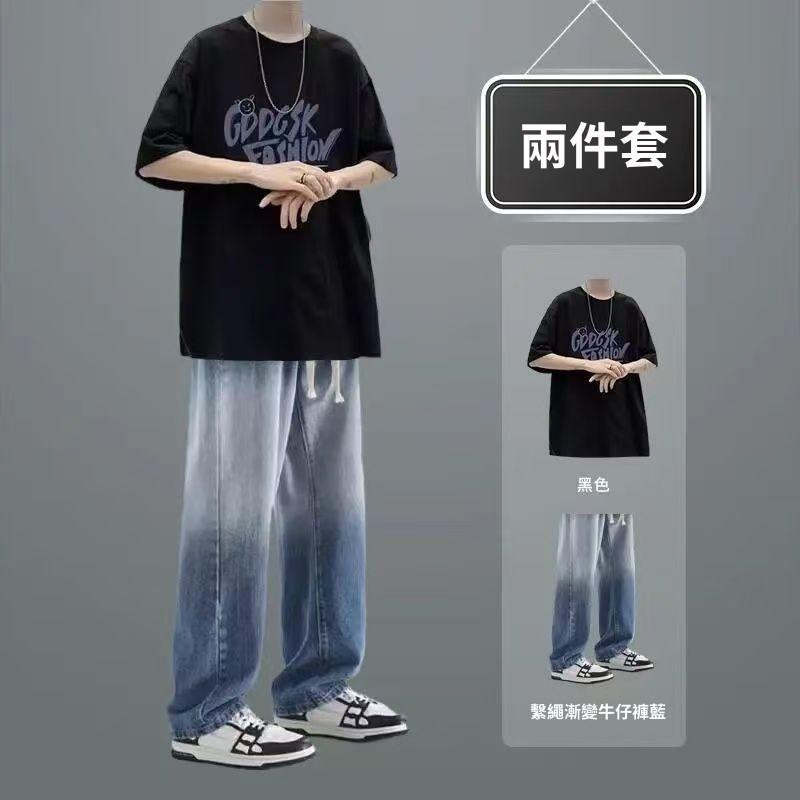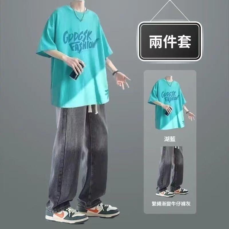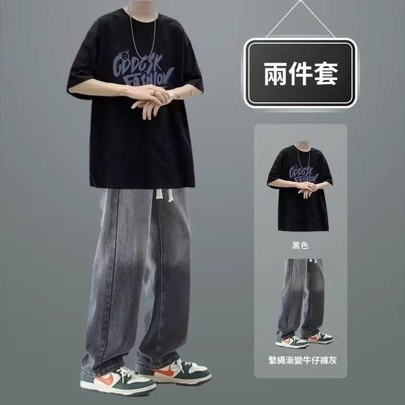 夏季短袖男生休閒套裝潮T恤男裝一整套搭配直筒牛仔褲兩件套穿搭
