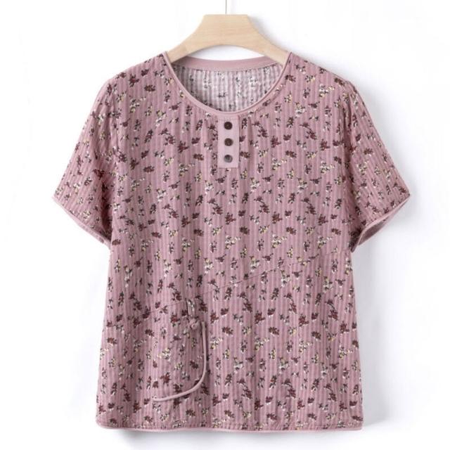 新品上架 中老年 夏季棉麻T恤女奶奶圓領碎花上衣媽媽新款短袖夏裝老人衣服