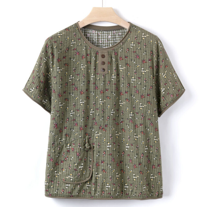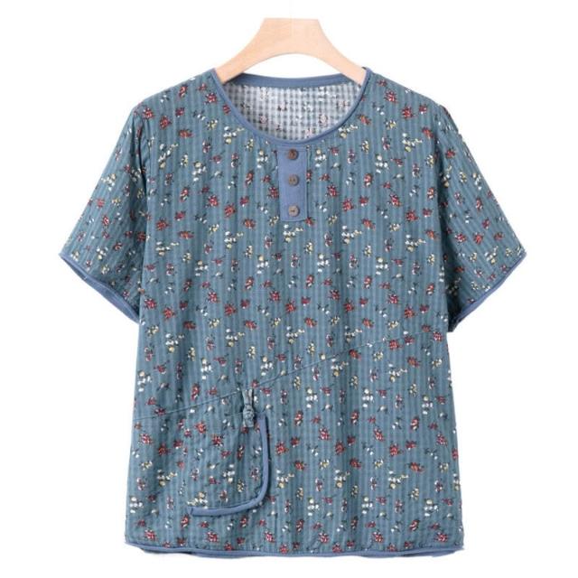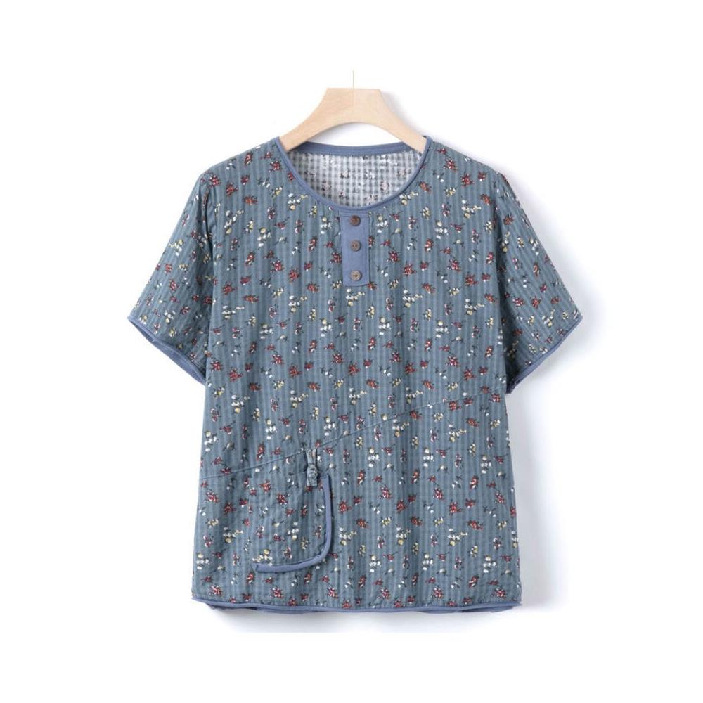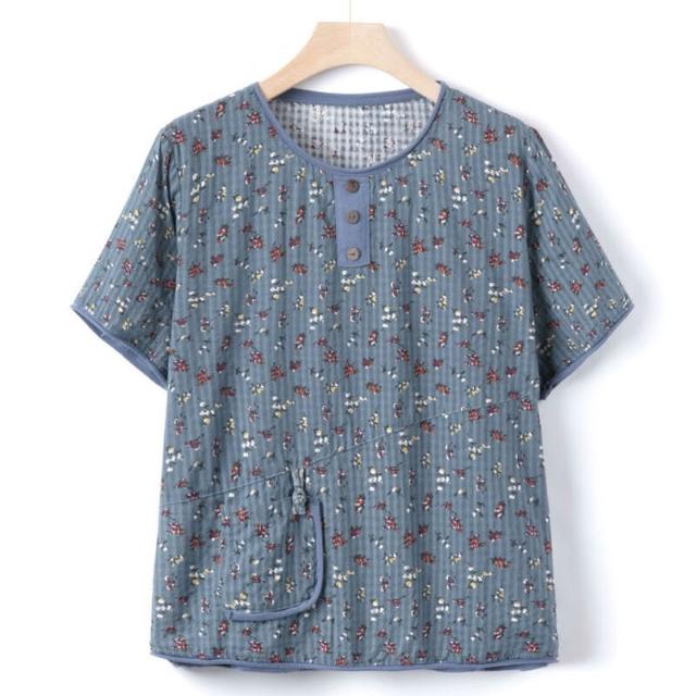 新品上架 中老年 夏季棉麻T恤女奶奶圓領碎花上衣媽媽新款短袖夏裝老人衣服