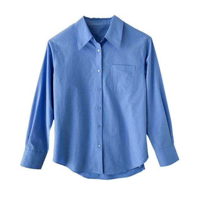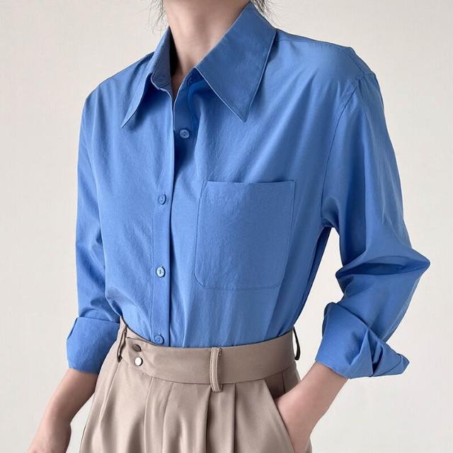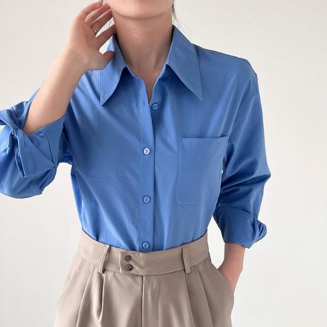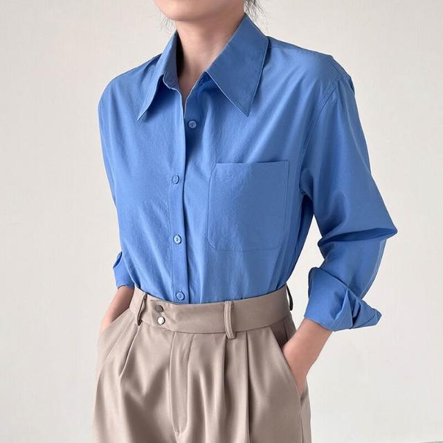 新品上架 果汁襯衫 克萊因藍法式空氣感職業通勤秋冬微寬松廓形長袖襯衣女