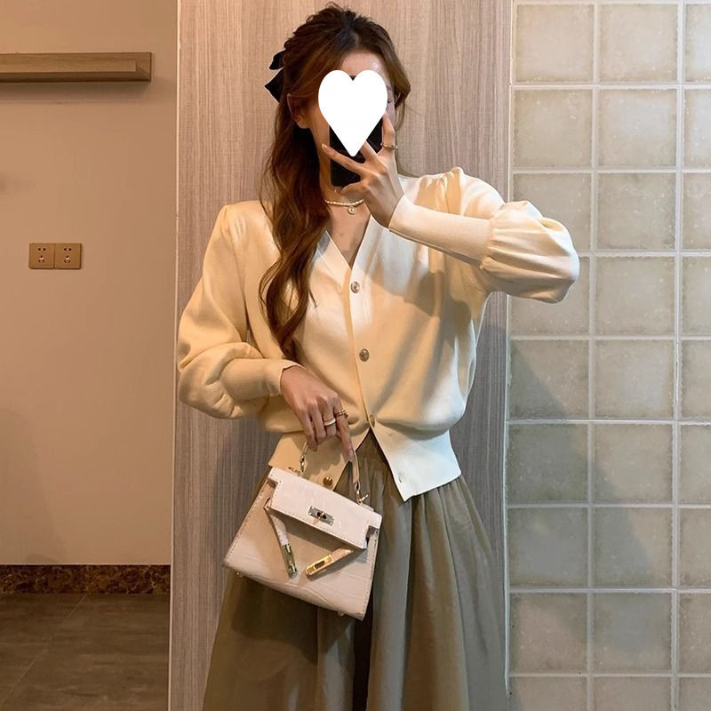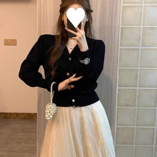 新品上架 黑色V領針織開衫女春秋收腰外搭毛衣短款修身外套洋氣打底衫上衣