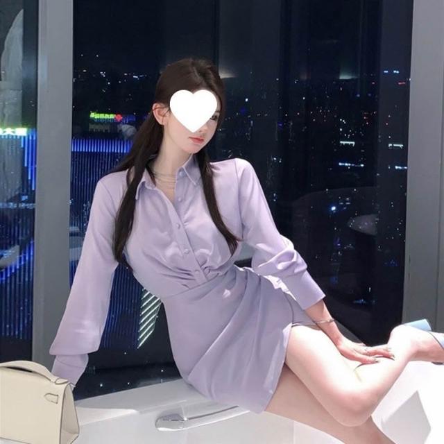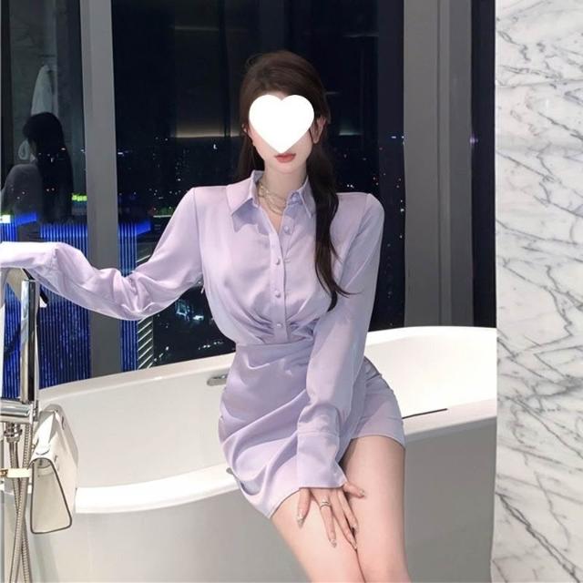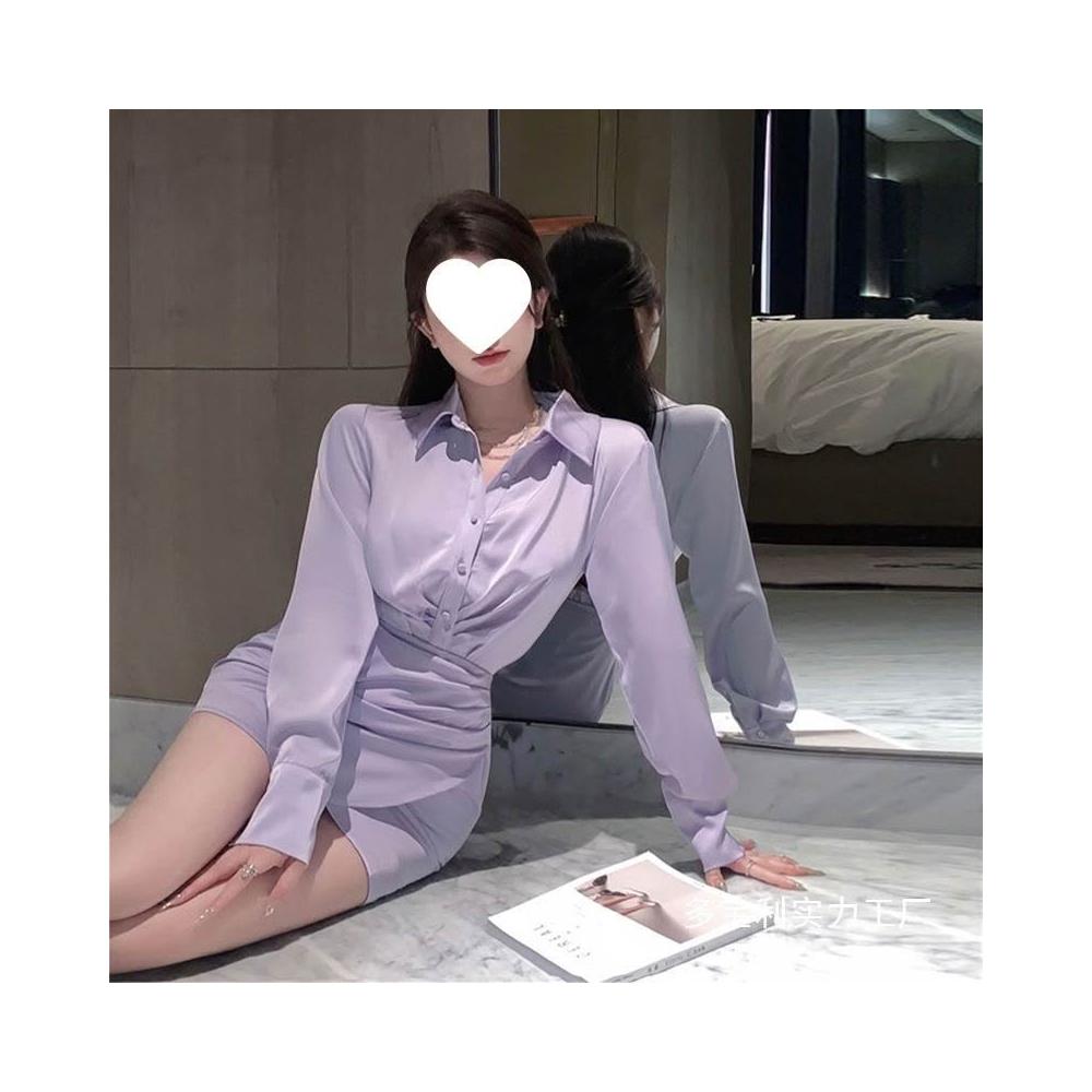 新品上架 辣妹新款氣質淡紫色緞面長袖襯衫連衣裙女秋季修身顯瘦收腰包臀裙