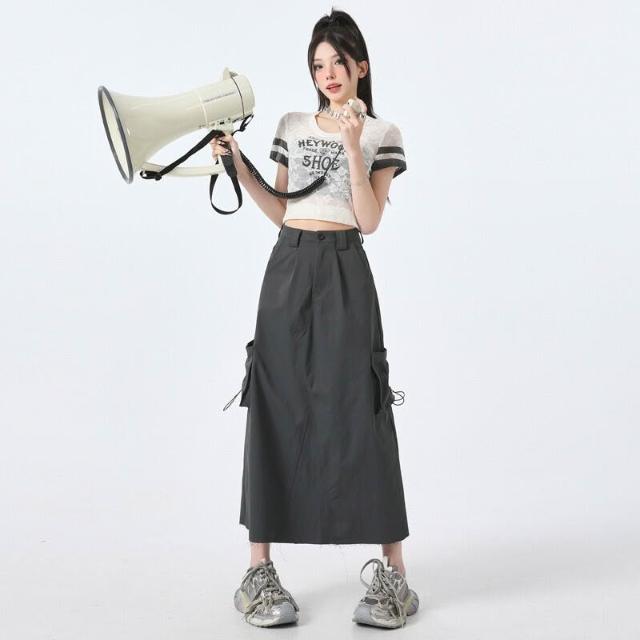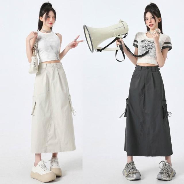 春夏上新 美式開叉工裝半身裙女2025春夏新款高腰顯瘦中長款潮流毛邊A字裙