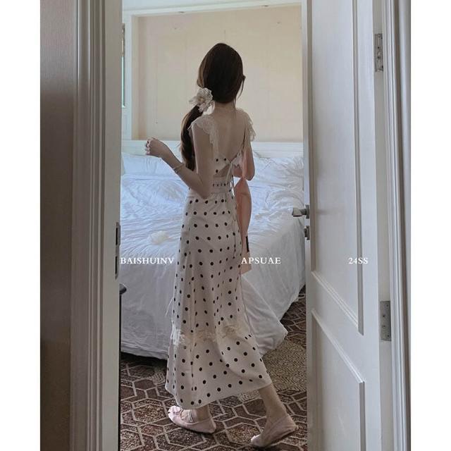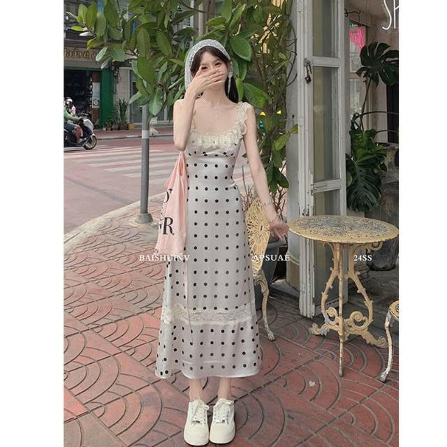 春夏上新 新款波點吊帶裙法式連衣裙女夏長裙緞面裙子收腰禦姐輕熟風性感