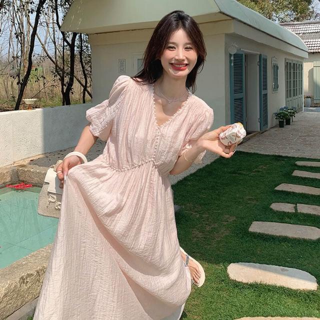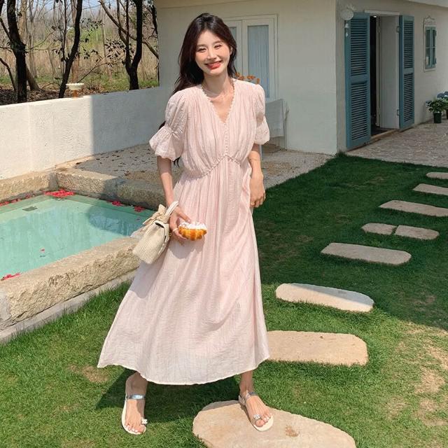 春夏上新 浪漫氛圍感珍珠包邊天絲連衣裙2026新款簡約氣質V領高腰A字大擺裙