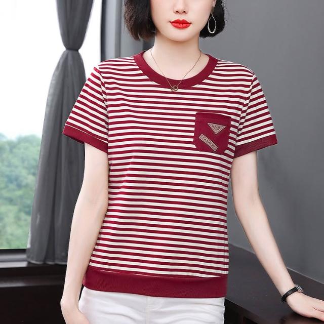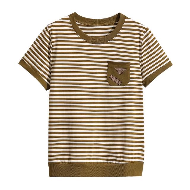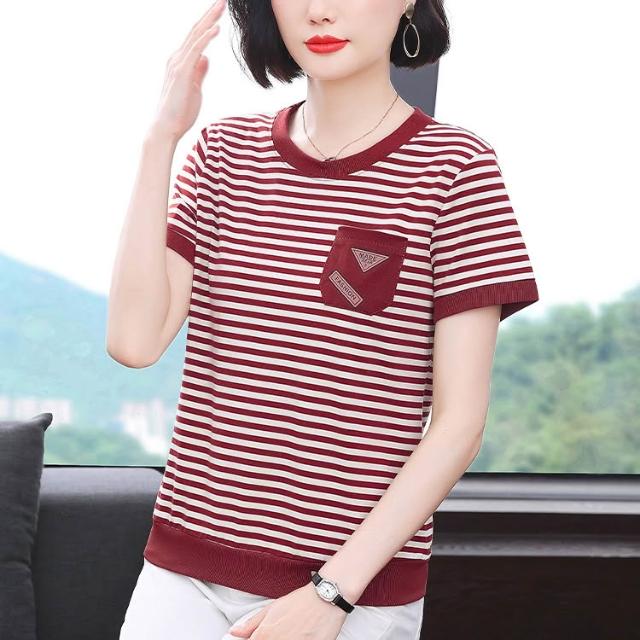 春夏上新 短袖 t桖 2026春季新款媽媽裝條紋口袋短袖女士高級感小眾設計寬松顯瘦拼接