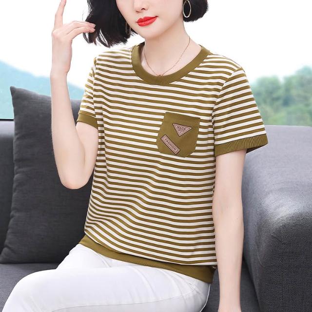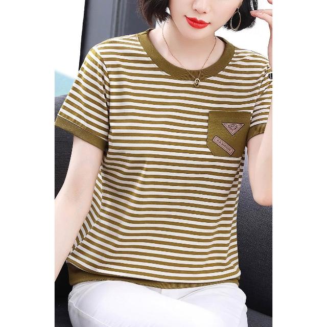 春夏上新 短袖 t桖 2026春季新款媽媽裝條紋口袋短袖女士高級感小眾設計寬松顯瘦拼接