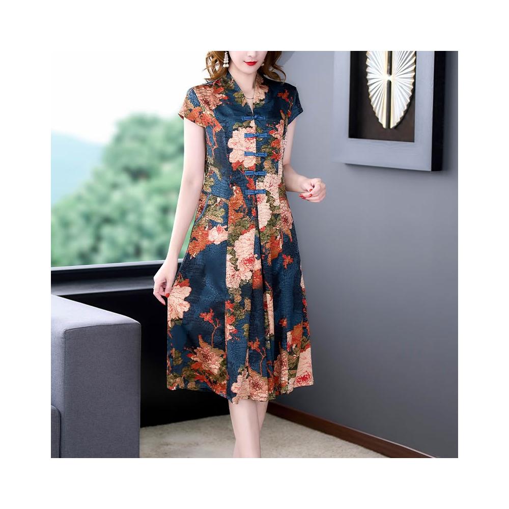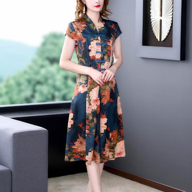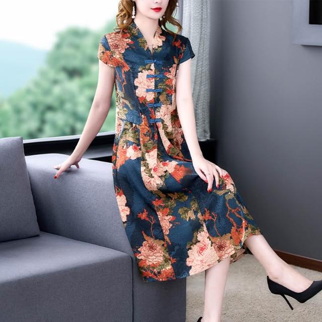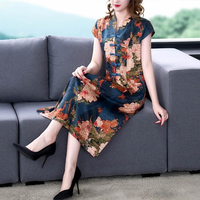 裙子 長裙 通勤裙子 新款媽媽夏裝洋氣連衣裙中年女裝改良旗袍中老年唐裝氣質大碼裙子 五域生活