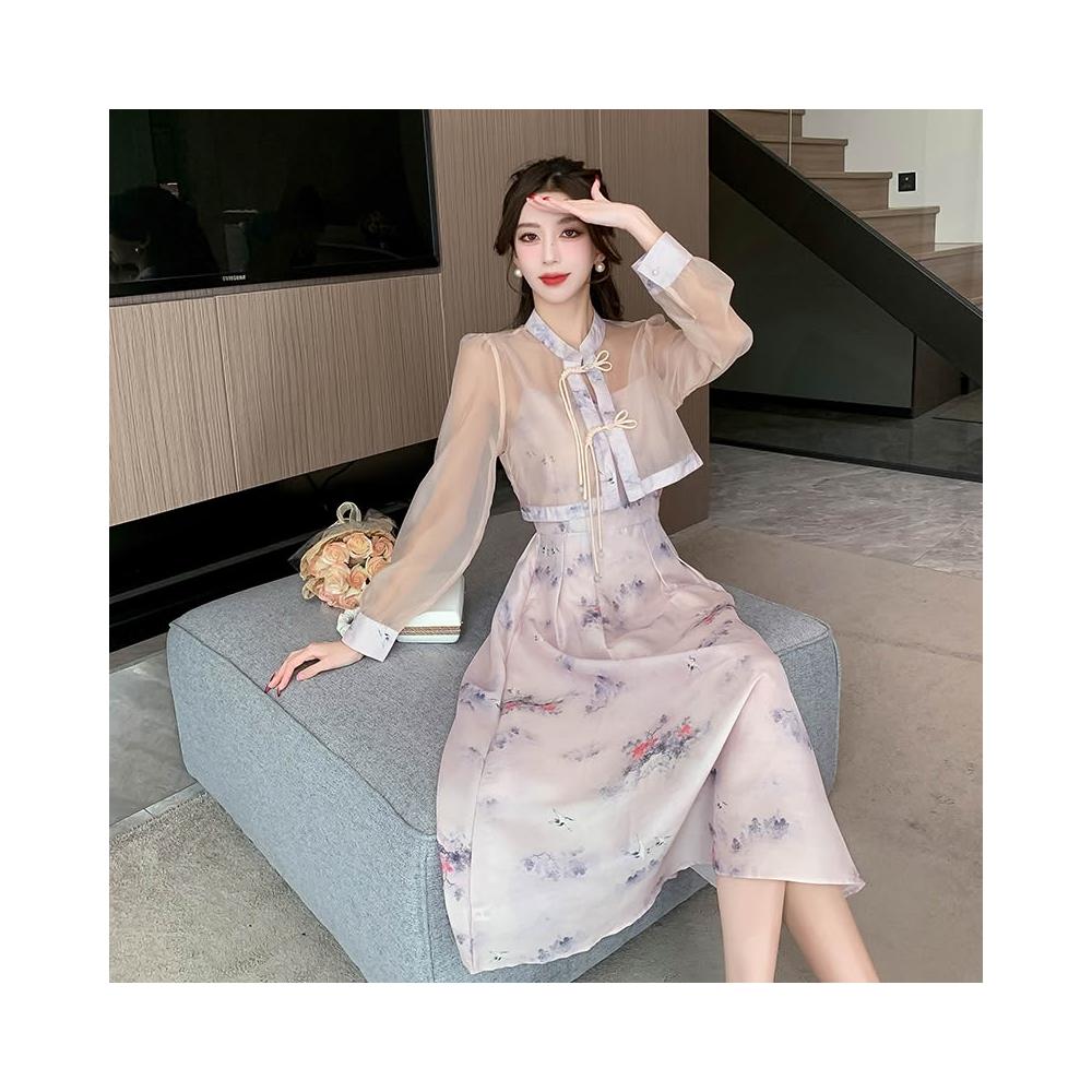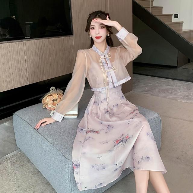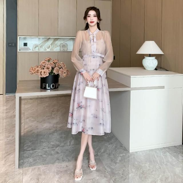 裙子 長裙 通勤裙子 2024年春款新中式國風印花吊帶連衣裙女裝改良漢服短款襯衫兩件套 五域生活