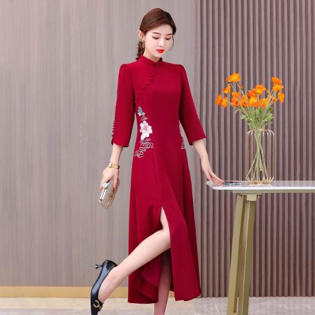 女裙 长裙 裙子 2026中式斜襟刺繡國風茶服連衣裙媽媽款婚宴裝高級感喜婆婆裝 五域生活