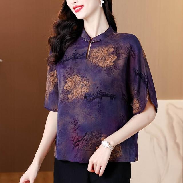 女装 两件套 套装 桑蠶絲香雲紗上衣中袖春夏季新款國風印花真絲上裝媽媽兩件套寬松 五域生活