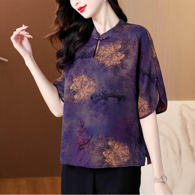 女装 两件套 套装 桑蠶絲香雲紗上衣中袖春夏季新款國風印花真絲上裝媽媽兩件套寬松 五域生活