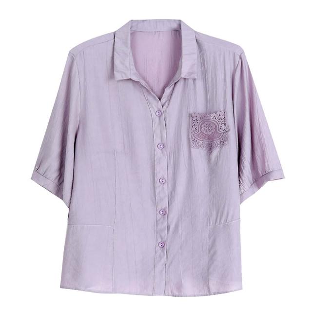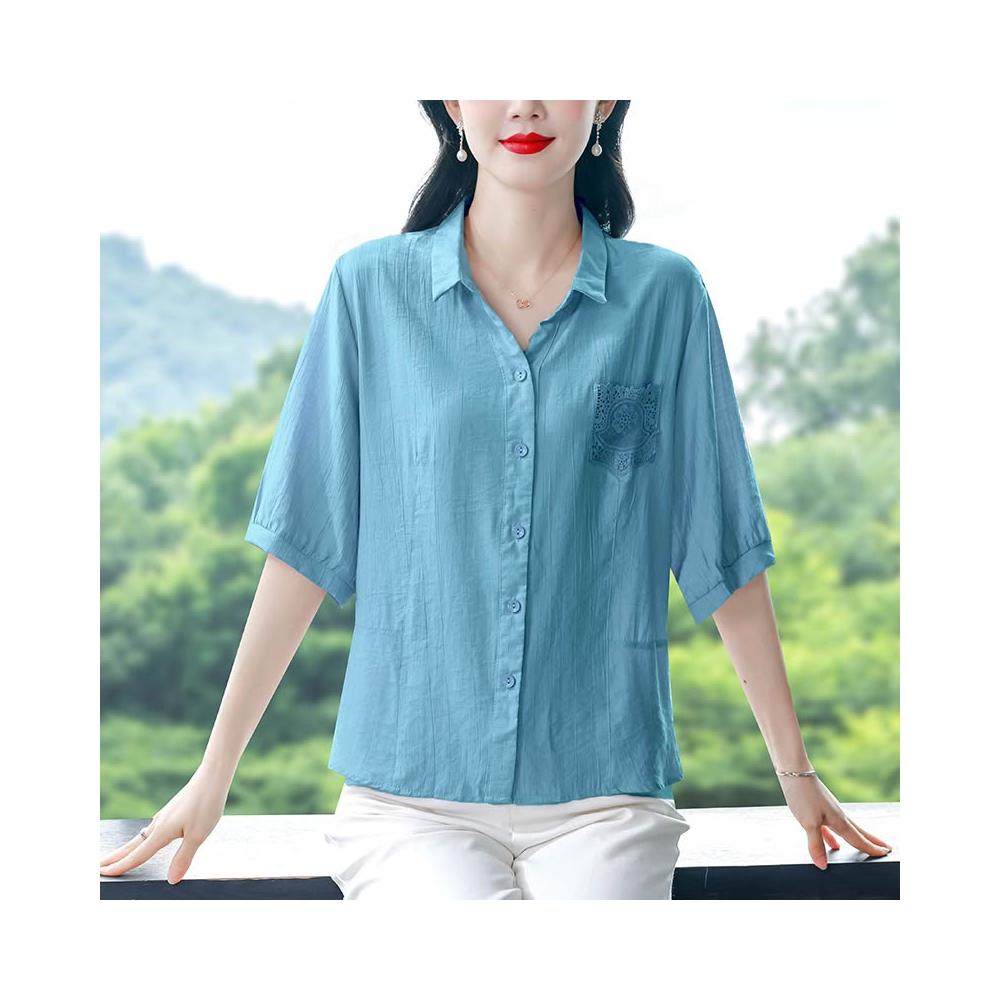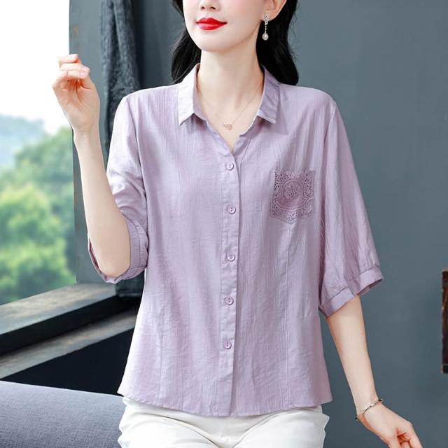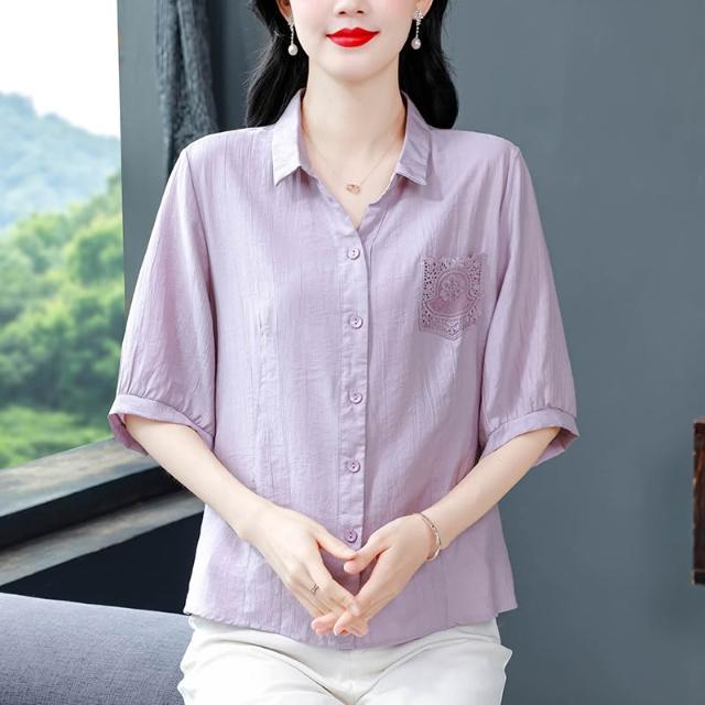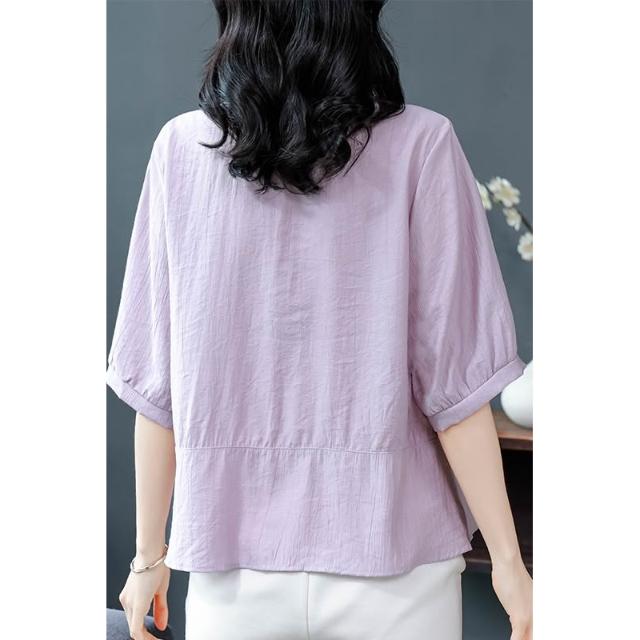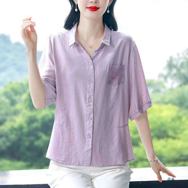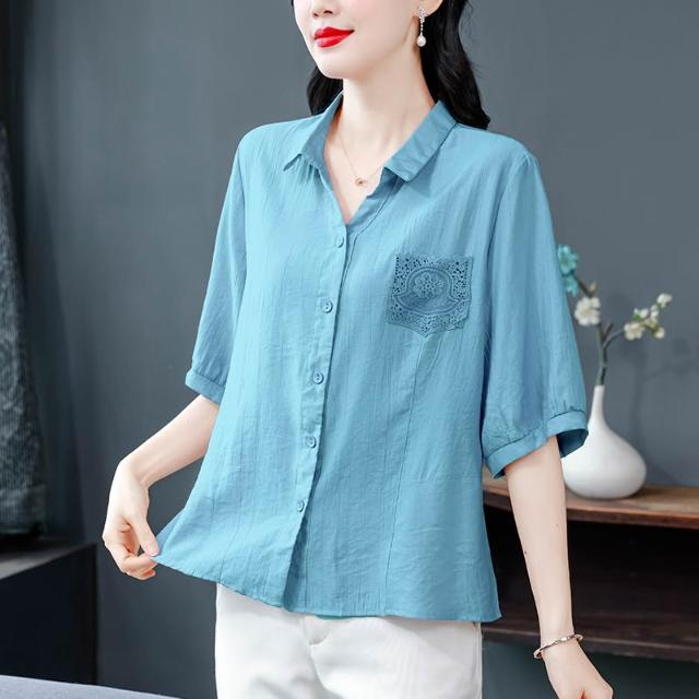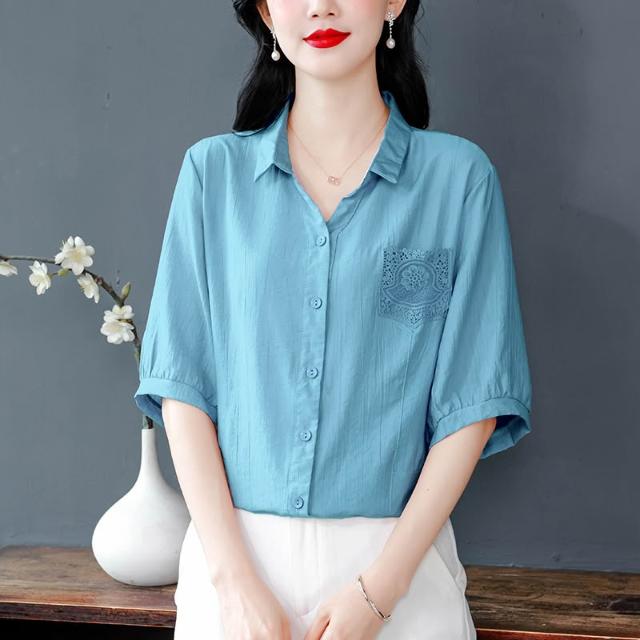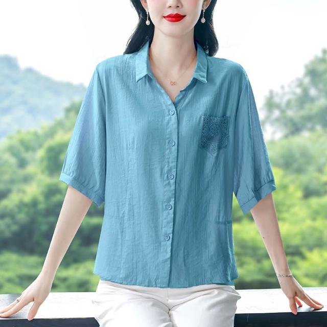 t桖 短袖 女上衣 中年媽媽夏裝襯衫女新款蕾絲口袋寬松大碼棉麻上衣遮肚子顯瘦小衫 五域生活