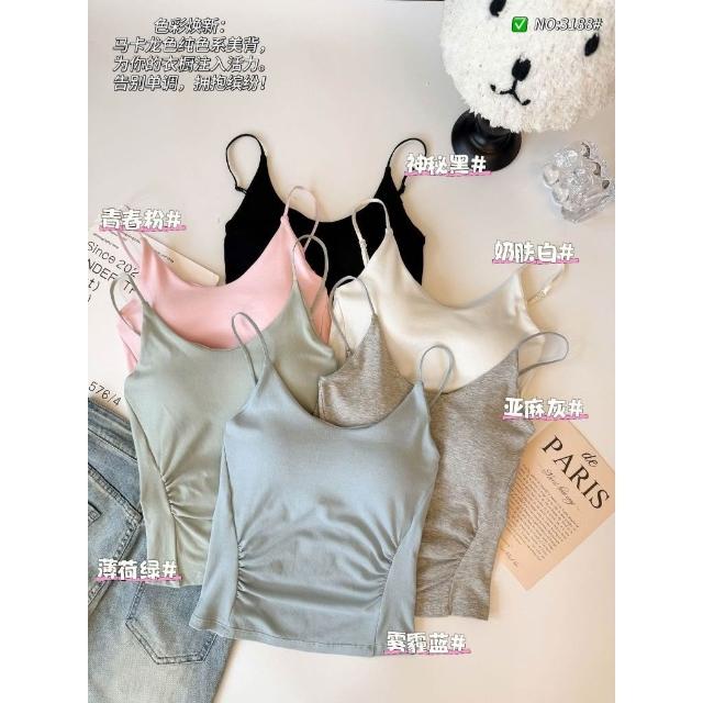 依依服飾 夏季新款多巴胺素色小吊帶 韓版性感褶皺帶胸墊免穿內衣吊帶背心bra top內搭吊帶 小可愛 背心
