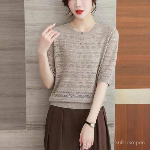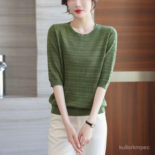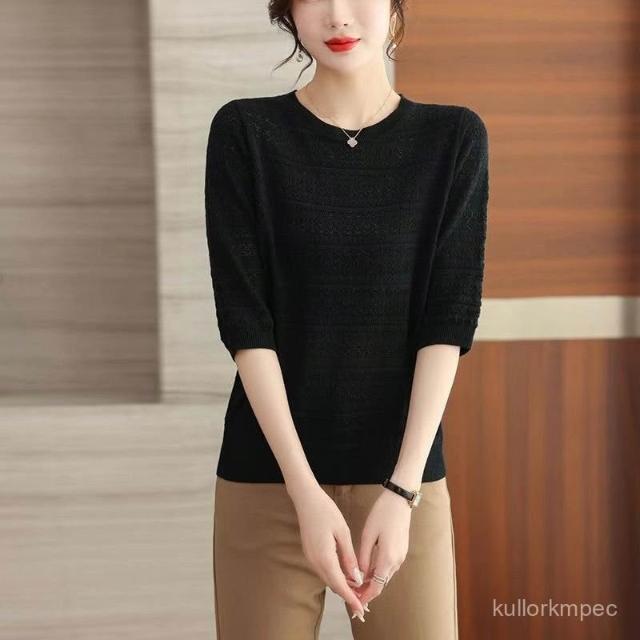 中袖七分袖上衣女薄款春秋新款女裝時尚媽媽夏季短款t恤針織小衫
