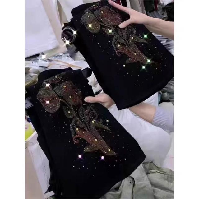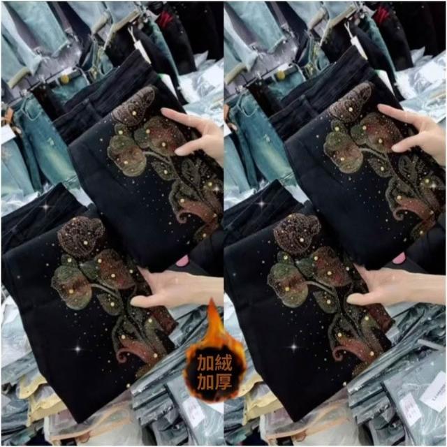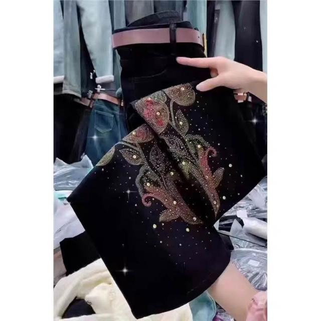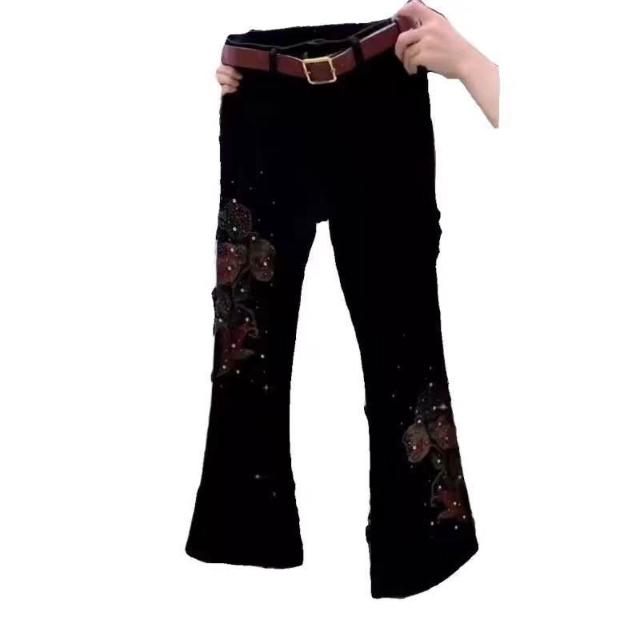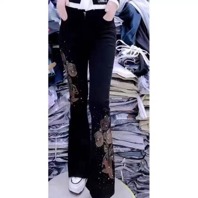 牛仔褲女新款高腰修身顯瘦時尚彈力黑色微喇叭褲帶鑽個性款