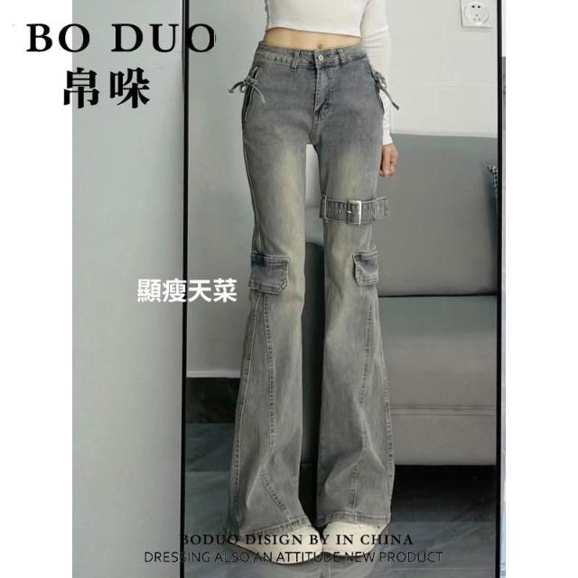 美式復古重工拼接設計感微喇牛仔褲女新款修身顯瘦馬蹄褲