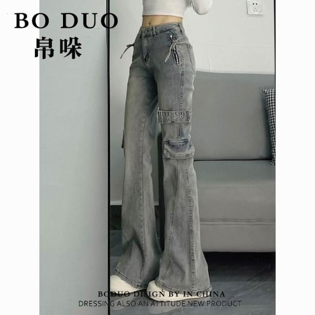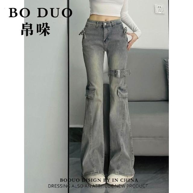 美式復古重工拼接設計感微喇牛仔褲女新款修身顯瘦馬蹄褲