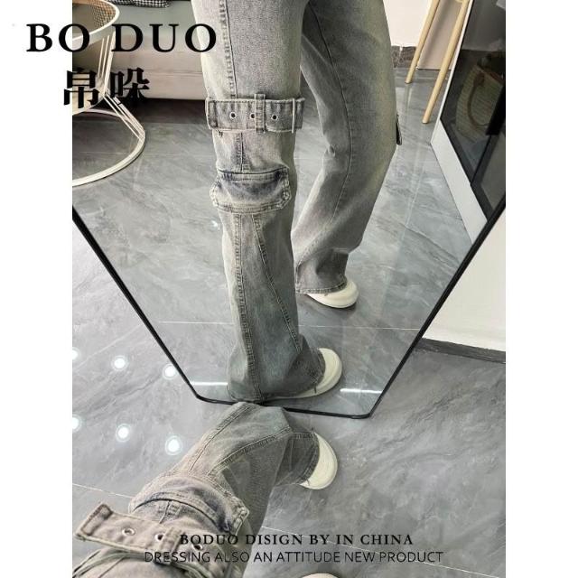 美式復古重工拼接設計感微喇牛仔褲女新款修身顯瘦馬蹄褲
